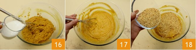 Continuad batiendo, luego añadid el aceite de semillas en hilo 13 y cuando todos los polvos estén bien incorporados, aromatizad con canela en polvo 14. En este punto, añadid la pulpa de calabaza 15.