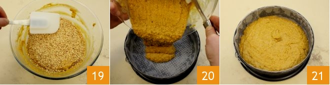 e incorporadlo al compuesto 19. Engrasad y cubrid con papel de horno un molde de 24 cm de diámetro y verted dentro la masa del bizcocho (20-21). Coced en horno estático precalentado a 180° durante 40 minutos (si el horno es ventilado a 160° durante unos 30 minutos).