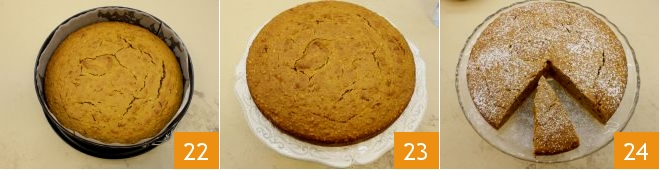 Una vez cocido, sacadlo del horno 22 y dejad que se temple ligeramente antes de desmoldarlo y dejarlo enfriar completamente 23; antes de servir, podéis espolvorear este bizcocho de calabaza con azúcar glas 24.