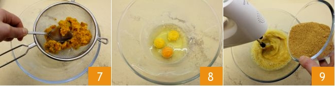 luego pasad la calabaza cocida por un tamiz para eliminar el exceso de agua 7. En un bol aparte, romped los huevos 8 y batidlos con una batidora eléctrica; añadid el azúcar moreno 9 y continuad batiendo para que el azúcar se disuelva.