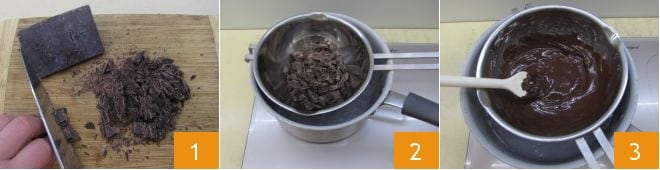 Para preparar el bizcocho de peras y chocolate, comienza picando groseramente el chocolate negro con un cuchillo 1, luego transfiérelo a un bol colocado dentro de una cacerola con agua, para la cocción al baño maría (el agua debe llegar a rozar el fondo del cazo en el que has insertado el chocolate) 2. Derrite el chocolate a fuego moderado hasta que resulte una salsa densa 3, luego déjalo entibiar. Mientras tanto, prosigue con la preparación.
