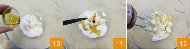 la miel 10 y las semillas extraídas de la vaina de vainilla 11. Monta la mezcla con las varillas eléctricas hasta que esté clara y espumosa 12