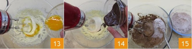 luego incorpora también los huevos, continuando a montar con las varillas 13. Por último, vierte el chocolate previamente fundido 14. Ahora añade a la mezcla también los polvos tamizados poco a poco con una cuchara 15, sin dejar de montar con las varillas eléctricas.