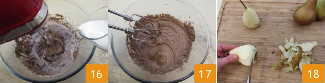 Para terminar, vierte en hilo la leche a temperatura ambiente 16 y continúa mezclando hasta que obtengas una mezcla homogénea 17. Pela las peras teniendo cuidado de mantener el pedúnculo, luego iguala con un cuchillo la parte inferior 18.