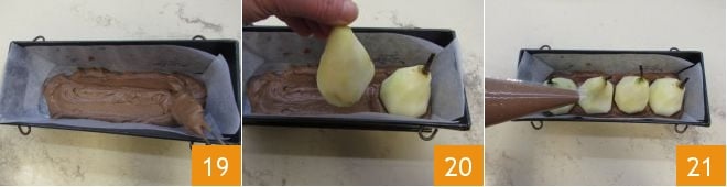 Unta con mantequilla y enharina un molde de bizcocho de 27x11 cm con un borde alto de 8 cm, de 1,5 litros de capacidad (alternativamente puedes untarlo con mantequilla y luego forrar el fondo y los bordes con papel para horno). Se aconseja un molde desmontable que permitirá desmoldar el dulce más fácilmente. Distribuye una capa de masa dentro del molde 19, luego coloca las peras peladas de modo que estén en posición vertical, con el pedúnculo hacia arriba 20 transfiere el resto de la mezcla a una manga pastelera y termina de llenar el molde 21 distribuyendo la masa alrededor de las peras,