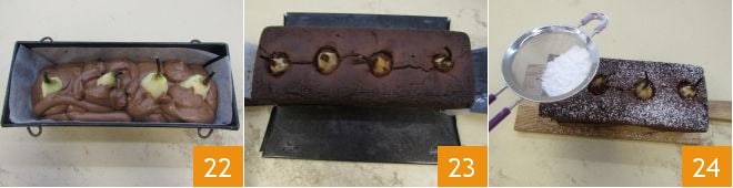hasta cubrirlas completamente, dejando fuera solo los pedúnculos 22. Hornea el pastel en horno estático precalentado a 170° durante 75 minutos, si durante la cocción el bizcocho se oscurece excesivamente, cúbrelo con papel de aluminio y continúa la cocción de esta manera. Al terminar la cocción, saca el bizcocho de peras y chocolate del horno y déjalo enfriar, luego desmóldalo 23 y espolvorea la superficie con azúcar glas 24. ¡El bizcocho de peras y chocolate está listo para ser disfrutado!