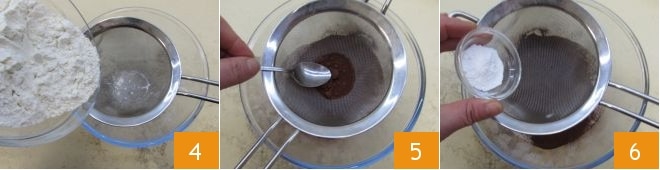 En un bol tamiza la harina tipo 00 4, el cacao amargo 5 y la levadura química para postres 6, ayudándote con el dorso de una cucharilla.