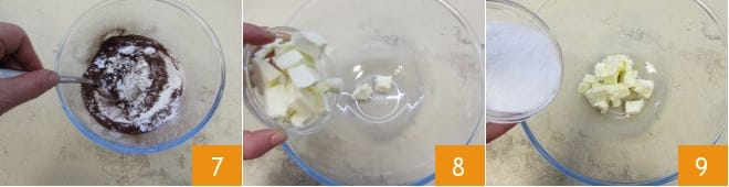 Mezcla los polvos para amalgamarlos 7. En otro bol aparte coloca los trozos de mantequilla ablandada 8, el azúcar granulado 9,