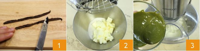 Para preparar el bizcocho de pistacho comenzad tomando la vaina de vainilla, abridla por la mitad, extraed las semillas y reservadlas 1; alternativamente podéis usar un sobre de vainillina. Colocad en el bol de una batidora, equipada con varillas, la mantequilla a temperatura ambiente junto con el azúcar 2 y mezclad todo accionando la máquina. Con la batidora en marcha añadid también las semillas de la vaina de vainilla a la mezcla de mantequilla y azúcar, después incorporad la pasta de pistacho 3 (si no encontráis la pasta de pistacho podéis hacerla triturando finamente los pistachos pelados),