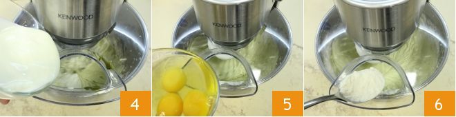 el yogur 4, los huevos uno a uno 5 y la sal. Cuando los huevos estén integrados en la mezcla, añadid también la harina y la levadura tamizadas 6