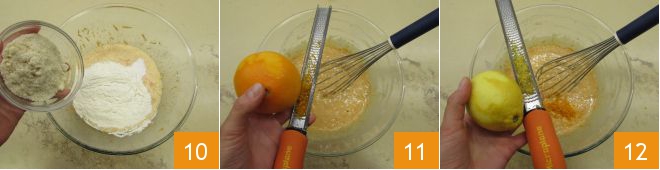 Añade ahora también la harina de almendras 10. Mezcla de nuevo para obtener una mezcla homogénea y sin grumos. Aromatiza con la ralladura de naranja 11 y limón 12.