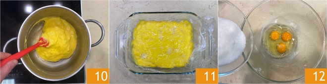 A este punto, la crema está lista 10, así que vertedla en una fuente y cubridla con film transparente a contacto 11; dejadla enfriar primero a temperatura ambiente y luego en la nevera durante al menos 3 horas. Mientras tanto, ocupáos de la masa del plumcake: en un bol verted los huevos y el azúcar 12