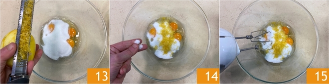 Añadid la ralladura de limón 13 y una pizca de sal 14, luego batid con las varillas eléctricas durante 5-8 minutos 15 hasta obtener una mezcla clara y espumosa.