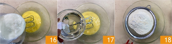 Incorporad el yogur 16 y el aceite de girasol 17, mezclando para integrarlos. Añadid los ingredientes secos tamizándolos con un colador: empezad por la harina 18.