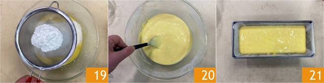 Continuad con la fécula y la levadura 19. Trabajad de nuevo con las varillas a baja velocidad, solo el tiempo necesario para obtener una masa lisa 20. Vertedla en el molde de 25x10 cm, ya engrasado y forrado con papel de horno 21, y hornead en horno estático precalentado a 175° durante unos 40-45 minutos, colocándolo en la rejilla baja.