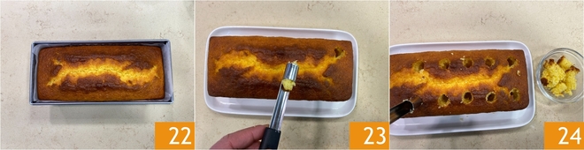 Tras los primeros 25-30 minutos podéis abrir rápidamente el horno y girar el molde para que la cocción sea más uniforme; hacia el final comprobad la cocción con la prueba del palillo. Sacad del horno y dejad enfriar completamente 22. Ahora, con un cavatorsoli, haced varios agujeros en la superficie del plumcake, organizándolos idealmente en unas 2 columnas por 7-8 filas, de modo que obtengáis en total entre 14 y 16 cavidades 24. Recoged los restos de masa resultantes, cortadlos en trozos y reservadlos para la decoración.