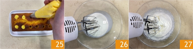 Ahora retomad la crema pastelera, mezcladla para que vuelva a quedar lisa y cremosa y rellenad las cavidades del plumcake ayudándoos con una manga pastelera 25. A continuación convertid la crema sobrante en una diplomática: montad la nata fresca con las varillas 26 hasta que esté firme y espumosa 27