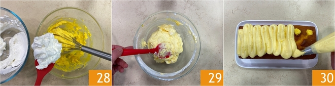 Añadid 150 g de nata montada a la crema restante 28 e incorporad con cuidado, procurando no bajar la mezcla 29. Pasad la crema diplomática a una manga pastelera con boquilla lisa y cubrid toda la superficie del plumcake 30.