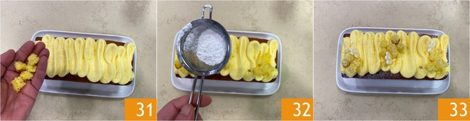 Por último decorad repartiendo las migas de plumcake reservadas 31 y espolvoread con azúcar glas 32; completad con alguna florecita de pasta de azúcar. Conservad el plumcake mimosa en la nevera hasta el momento de servirlo 33.