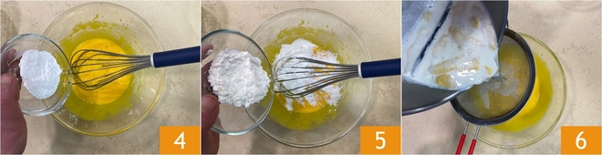 Incorporad la maicena 4 y el almidón de arroz 5 y mezclad de nuevo. Cuando la leche haya llegado a hervir, vertedla en el bol filtrándola 6