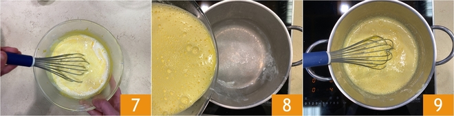 Mezclad inmediatamente para obtener una mezcla homogénea 7. Pasadlo todo a una cacerola 8 y dejad que espese al fuego, removiendo a menudo 9