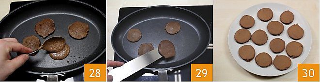 Forma con la masa pequeños círculos, dejándola caer desde la punta de la cuchara y manteniéndola siempre en el centro, para obtener círculos perfectos 28. Deja cocinar durante unos 1 minuto luego voltea tu blini del otro lado y cocínalo otro minuto 29. Una vez listos, coloca los blinis en un plato llano a templar y continúa así hasta terminar toda la masa 30.