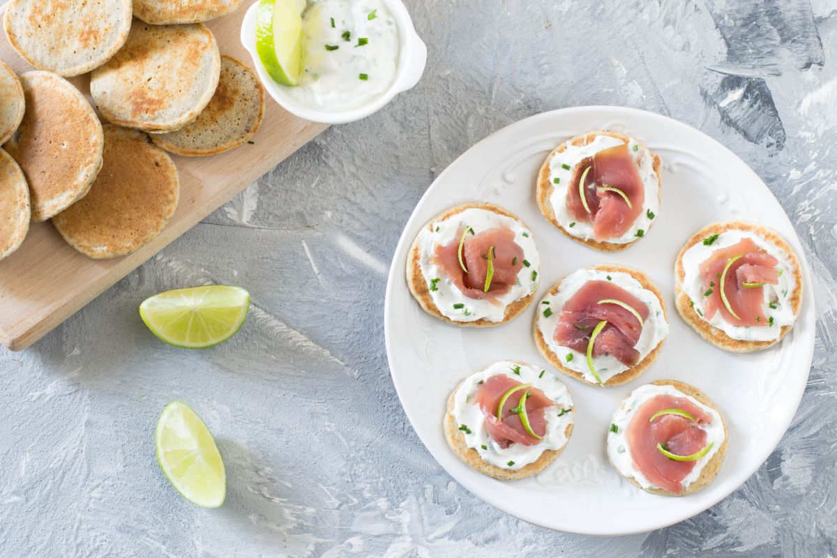 Un aperitivo perfecto para quienes buscan una receta sin gluten que ofrecer como aperitivo para una cena entre amigos: los blinis de trigo sarraceno con atún ahumado son porciones individuales de sabor rico, ideal para aquellos que son intolerantes y no quieren renunciar al sabor, pero irresistible también para todos los demás. El queso de cabra combina perfectamente con el atún ahumado y juntos hacen de esta variante de las Blinis un apetitoso finger food para disfrutar en compañía. La harina de trigo sarraceno con su sabor completo, el retrogusto de frutos secos y la nota rústica ofrece una base perfecta para acoger el relleno delicioso pero al mismo tiempo refinado.