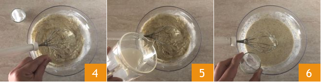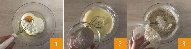 Para preparar los blinis de trigo sarraceno con atún ahumado, vierta el yogur y el huevo en un bol y mézclelos con un batidor 1, agregue la harina de trigo sarraceno 2 y la fécula 3; continúe mezclando.