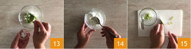 ajuste de sal 13, mezcle 14. Pele un trozo de la lima y corte la cáscara en rodajas finas 15.