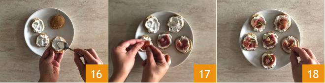 Recupere los blinis y unte cada uno con la crema de queso 16 coloque las rodajas de atún ahumado 17 y decore con la cáscara de lima cortada en tiras y un poco de cebollino 18. Los blinis de trigo sarraceno con atún ahumado están listos 18.
