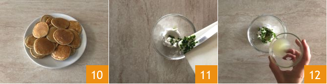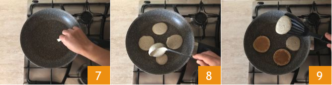 En una sartén derrita un trocito de mantequilla 7 luego vierta 3-4 cucharones de masa (aproximadamente 6 cm de diámetro) según el ancho de la sartén 8. Después de aproximadamente 1 minuto, gire los blinis para cocinarlos del otro lado 9, comenzando por el primero vertido. Cocínelos por un minuto más o poco más. Con las cantidades indicadas obtendrá aproximadamente 18 piezas.