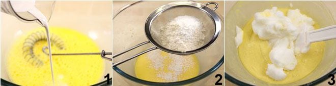 Para preparar los blinis comience con la preparación de la masa base: separe la yema de la clara y bata la yema en un bol, añada la leche y la nata poco a poco mezclando bien para evitar que se formen grumos 1. Agregue luego la harina y la levadura tamizadas y continúe mezclando 2. Deje reposar la masa durante aproximadamente una hora. Agregue luego a la masa la clara batida a punto de nieve con una pizca de sal, teniendo cuidado de no desinflarla 3.