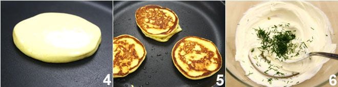 Caliente y unte con un poco de mantequilla una sartén antiadherente para crepes, cuando esté bien caliente, coloque un cucharón de masa que se inflará formando una crepe con un diámetro de aproximadamente 7 cm 4. Cuando el fondo se haya solidificado, dé la vuelta al blini ayudándose con una espátula y dore también el otro lado 5. Continúe así hasta terminar toda la mezcla. Comience a preparar la decoración para los blinis: en un bol pequeño mezcle la crema agria para hacerla cremosa y añada el eneldo picado (reservando un poco para decorar), sale y pimiente 6.