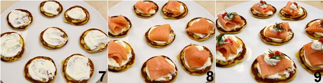 Unte la crema agria sobre los blinis 7, coloque una tira de salmón ahumado 8 y decore con otro poco de crema agria, eneldo y un poco de huevas de lumpo rojas 9. ¡Los blinis están listos para disfrutarse como un excelente aperitivo!