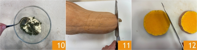 Mezcla y conserva en el frigorífico 10. Ahora dedícate a los filetes: corta los extremos de la calabaza 11, obtén rodajas de aproximadamente 1,5 cm de grosor 12 y elimina la piel; necesitarás unos 500 g de calabaza limpia.