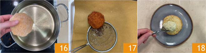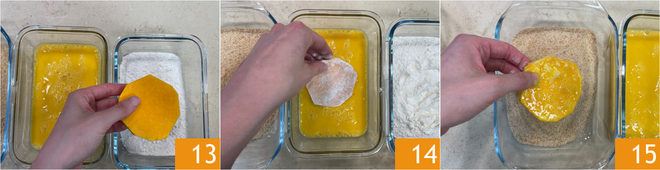 Pasa las rodajas de calabaza primero por la harina 13, luego por los huevos batidos 14 y finalmente por el pan rallado 15.