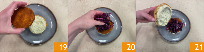 Coloca encima el filete 19, luego añade un puñado de repollo marinado y bien escurrido 20. Cierra con la otra mitad del panecillo en la que habrás untado un poco más de mayonesa y ¡aquí tienes tu bocadillo con filete de calabaza listo 21!