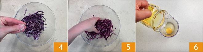 Para preparar el burger con filete de calabaza, comienza limpiando el repollo: elimina primero las hojas exteriores, luego córtalo finamente en tiras 1. Transfiere el repollo a un bol y condimenta con aceite 2 y vinagre 3.