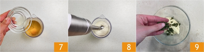 Añade una pizca de sal 4, mezcla y reserva 5. Pasa a la Mayonesa con batidora de mano: en un vaso alto, vierte el huevo y el aceite 6