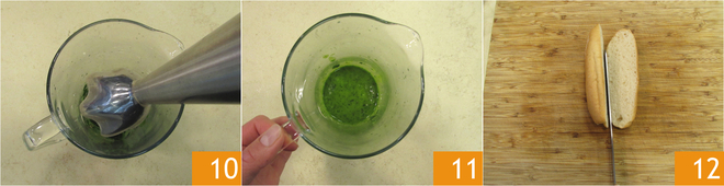 Tritura con la batidora de mano 10 para obtener una salsa suave 11. Corta por la mitad las mini baguettes 12.