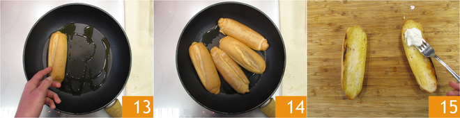 Vierte un hilo de aceite de oliva virgen extra en la sartén y calienta las mini baguettes 13 14. Una vez que las baguettes estén doradas, retíralas del fuego y colócalas en una tabla, ¡listas para ser rellenadas! Unta la stracciatella 15.