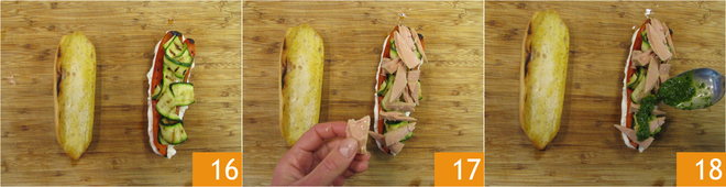Rellena con las verduras a la parrilla 16 y el atún 17. Completa con la salsa verde 18 y sirve inmediatamente el bocadillo con atún, verduras a la parrilla y stracciatella.