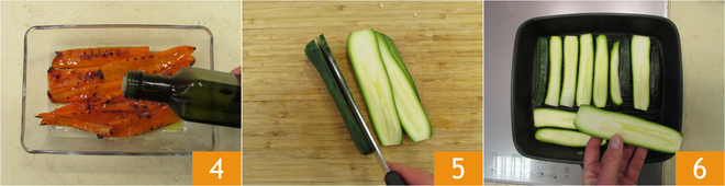 Transfiere el pimiento a una fuente y condimenta con aceite y sal 4. Corta los calabacines en tiras finas de aproximadamente ½ cm 5. Cocina también los calabacines en la parrilla caliente durante unos 5 minutos por ambos lados 6.
