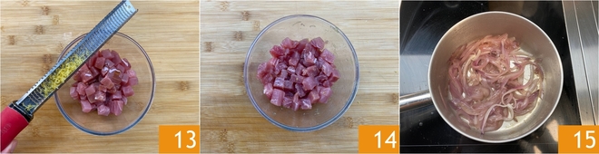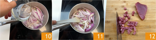 Añadid una primera parte de agua 10. La cantidad de agua será relativa al tamaño del cazo, en cualquier caso, podréis añadir más si es necesario. En total se necesitarán 10 minutos para estofar las cebollas. Mientras tanto, cortad el atún previamente congelado en cubitos 11.