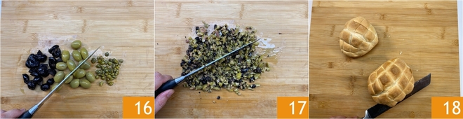 Transferid a una tabla de cortar los dos tipos de aceitunas y las alcaparras desaladas 16, picadlas con un cuchillo hasta obtener un picadillo 17. Ahora componed los bocadillos. Primero, abrid los dos panecillos cortándolos por la mitad 18.