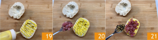 Colocad en la base del pan la mayonesa 19, encima el atún 20 y el picadillo de alcaparras y aceitunas 21.
