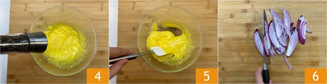 Agregad sal y pimienta 4, mezclad con una espátula 5 y reservad en el frigorífico. Limpiar las cebollas y cortarlas en gajos 6.