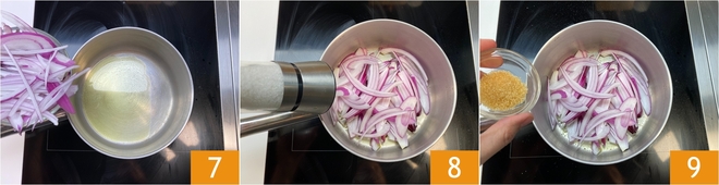En un cazo, verted el aceite y calentadlo. Agregad las cebollas 7, la sal 8 y el azúcar moreno 9.