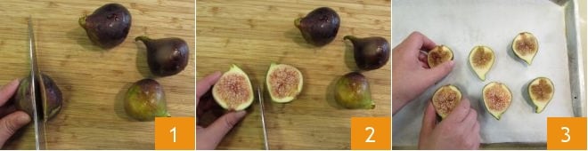 Para preparar el bocadillo con higos, lo primero que hay que hacer es lavar y secar las frutas, luego córtalas por la mitad (1-2) y colócalas en una bandeja cubierta con papel de horno, con la parte cortada hacia arriba 3.