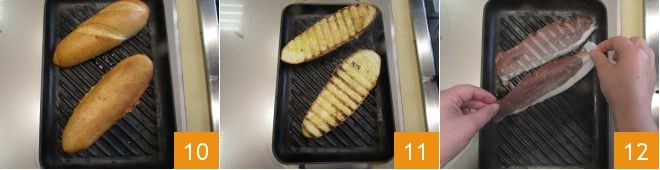 y luego tuéstalos en una parrilla bien caliente tanto de un lado 10 como del otro 11. Reserva los bocadillos y en la misma parrilla coloca el speck 12.